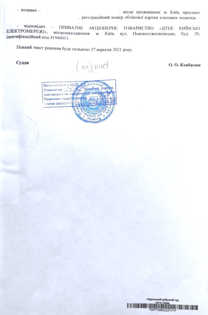 Отримали рішення суду про стягнення з ПрАТ «ДТЕК Київські електромережі» понад 92 тисячі гривень на користь нашого клієнта та всі судові витрати, зокрема й на правову допомогу.
